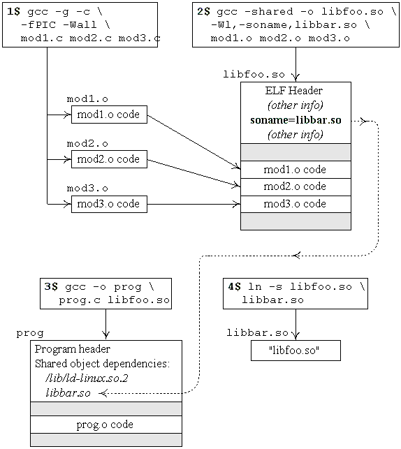 This diagram shows the steps required in building a shared library, linking a program against it, and creating the required soname symbolic link.
